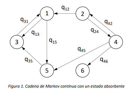 Para el cálculo de las probabilidades de absorción en cadenas continuas existen diferentes opciones. La primera consiste en obtener de la cadena en tiempo continuo la cadena embebida EMC, y realizar el análisis de las probabilidades de absorción en la EMC, ya que, para la distribución de la probabilidad de estado en el largo plazo, las dos cadenas son equivalentes.